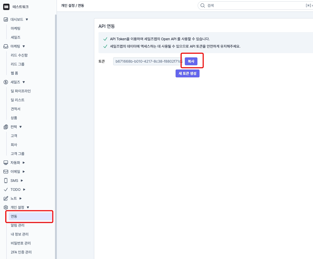 세일즈맵에 접속해 API 토큰을 복사합니다.