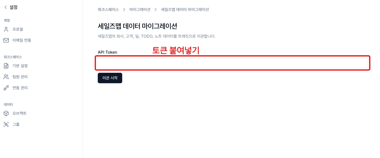 세일즈맵 가져오기 메뉴 주소 : https://app.trackit.so/{slug}/settings/migrations/salesmap