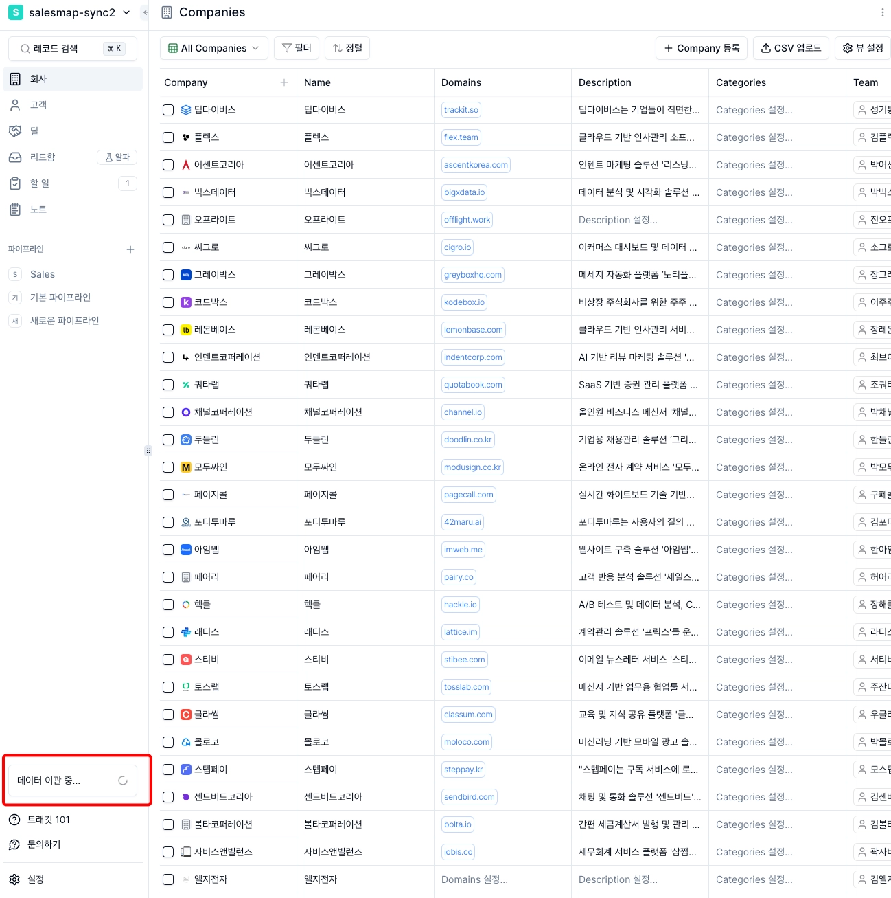 현재 세일즈맵에서 가져올 수 있는 데이터는 고객, 회사 정보, 딜과 파이프라인, 노트, To-Do 입니다.
